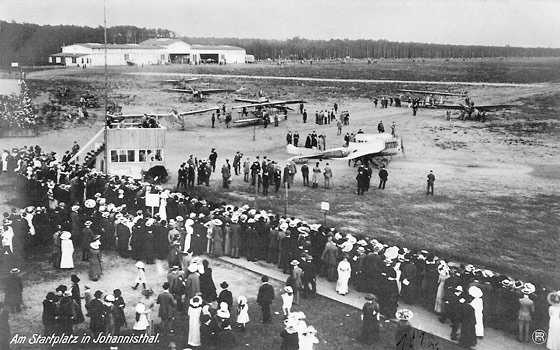 Ausgangspunkt für die Überlegungen, vor den Toren der Stadt Berlin ein Flugfeld zu schaffen, war das Bemühen, der bis dahin fortschrittlichsten Luftfahrtnation Frankreich endlich Paroli zu bieten. Am 26. September 1909 konnte das Flugfeld als erster Motorflugplatz Deutschlands mit einer Flugwoche in Betrieb genommen werden. Unmittelbar danach siedelten sich die rasch expandierenden Flugzeugfabriken, wie Wright, LVG, Rumpler, Fokker und andere, an. Johannisthal entwickelte sich zu einem Zentrum für Flugschauen und Flugwettbewerbe, hier konzentrierte sich die Schulung von Piloten, und mit dem Bau der Luftschiffhallen von Zeppelin und Parseval wurde dieser größte deutsche Luftfahrtstandort komplettiert. Diese Konzentration, noch gesteigert durch die Stationierung militärischer Einrichtungen im Vorfeld des 1. Weltkrieges führte eigentlich zwangsläufig dazu, dass bei der Standortentscheidung schließlich die Wahl auf Johannisthal/Adlershof als aufzubauendes Zentrum der deutschen Luftfahrtforschung fiel. 1912 etablierte sich im östlichen Teil des Platzes, auf Adlershofer Gebiet, die gerade gegründete Deutsche Versuchsanstalt für Luftfahrt (DVL). Deren Kapazitäten wurden im Interesse der Militärs rasch ausgebaut; Werkstätten, Labors, Prüfstände für Motoren und ein Windkanal entstanden.